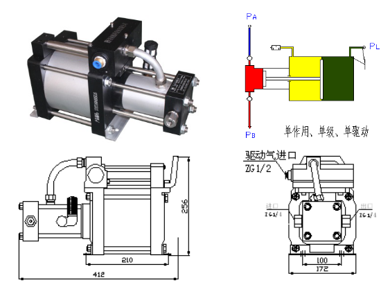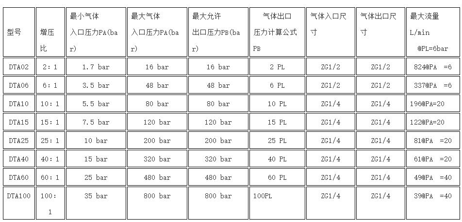 氣體增壓泵是標準單氣動頭單作用泵,可充氮氣、空氣及大部份氣體介質(zhì),泵體采用優(yōu)質(zhì)鋁合金和不銹鋼缸體活塞,驅(qū)動缸徑分160mm、200mm、240mm三種規(guī)格,具有結(jié)構(gòu)緊湊、堅固耐用、大流量等特點。所有DTA系列泵根據(jù)使用加壓介質(zhì)的不同采用相應材料密封件.