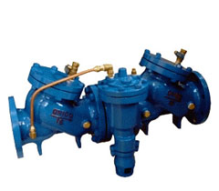 HS41XA帶過濾防污隔斷閥由兩個隔開的止回閥和一個液壓傳動到泄水閥組成,第一個止回閥閥體內裝有過濾網。由于止回閥的局部水頭損失,中間腔內的壓力始終低于入水口的壓力。這個壓差驅使泄水閥處于關閉狀態,管路正常供水。在壓力異常時,(即出口端壓力高于中堅腔),即使兩個止回閥都不能反向密封,安全泄水閥也能自動開啟將倒流水泄空,并形成空氣隔斷,保證上游供水衛生安全。