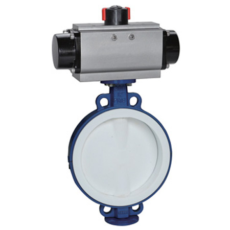 全襯氟氣動蝶閥由內襯PTFE蝶閥(閥體和閥板均襯PTFE)和氣動執行器組成,配合二位五通電磁閥或者二位三通換向電磁閥可以起到氣動閥門的開關切斷作用。再配合電氣定位器輸入4-20mA可以起到流量調節作用。