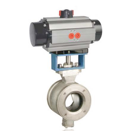 對夾式氣動V型切斷球閥是一種球芯通道設計成V型狀開口的閥門,具有精確的流量特性和控制功能。通過0-90度的旋轉動作,來達到流量的調節。閥座與球面之間無間隙摩擦,具有優良的剪切力和自潔能力,尤其適用于帶有纖維或帶有微小顆粒的流體介質。