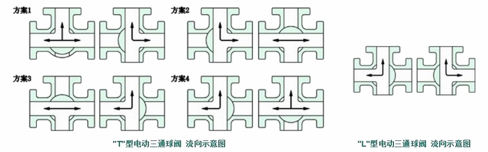 三通球閥分L型和T型,L型三通球閥適用于介質流向的切換,能使相互垂直的兩個通道連通:T型電動三通球閥適用于介質的分流、合流或流向 切換,T型孔道可以使三個通道互相連通或使其中兩個通道連通,電動三通球閥一般采用三個閥座結構,亦可根據用戶要求采用四閥座結構