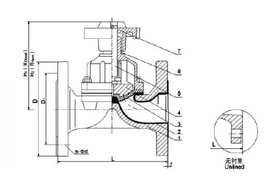 1.閥體 2.閥體襯里 3.隔膜 4.閥瓣 5.閥桿 6.閥蓋 7、手輪
