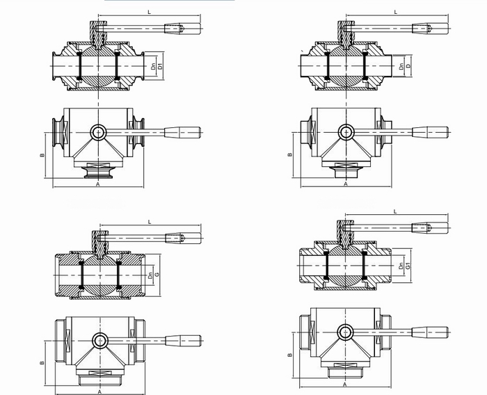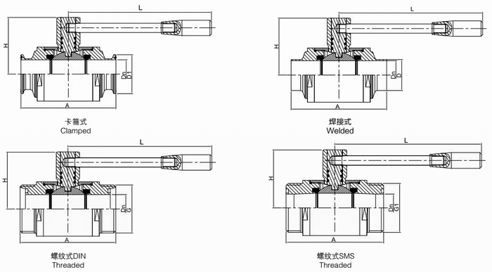 3.衛生級三通球閥:結構形式有T型及L型兩種,-個閥體,三個閥蓋,三個PTFE閥門座,球體,軸芯元件以及一個手柄(或氣動頭元件)構成,可增加清洗排泄口