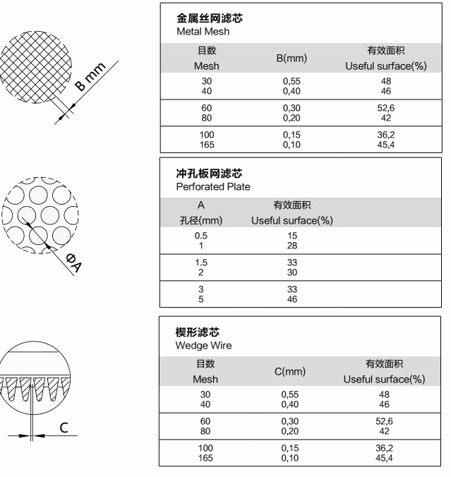 根據使用要求可選用不同的濾芯,其濾芯有三種類型(沖孔板網濾芯,金屬絲網濾芯及楔形濾芯),其過濾能力如下: