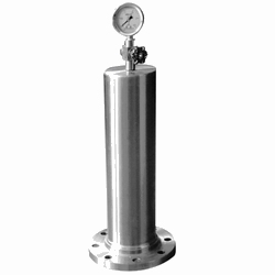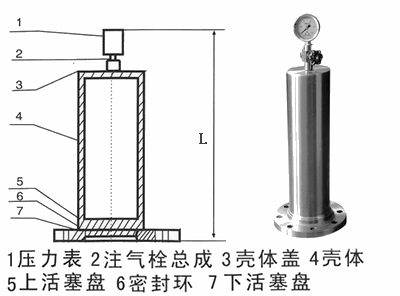 內部有一密閉的容氣腔,下端為一活塞,當沖擊波傳入水錘吸納器時,水擊波作用于活塞上,活塞將往容氣腔方向運動?;钊\動的行程與容氣腔內的氣體壓力、水 擊波大小有關,活塞在一定壓力的氣體和不規則水擊雙重作用下,做上下運動,形成一個動態的平衡,這樣就有效地消除了不規則的水擊波震蕩。
