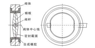 蝶板的回轉(zhuǎn)中心(即閥桿的中心)位于閥體的中心線和蝶板的密封面截面上。閥座采用合成橡膠。關(guān)閉時蝶板的外圓密封面擠壓合成橡膠閥座,使閥座產(chǎn)生彈性變形而形成彈性力作為密封比壓保證蝶閥的密封