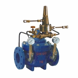 當主閥進出口間壓差變化時,接管A與接管B間壓差發生變化,此變導閥的開度。壓差大時導閥開度大,控制室通過C管的下泄水量增大,主閥控制室壓力下降,主閥開度增大,主閥進出口間壓差變小。反之,若主閥進出口間壓差變小,則導閥開度變小,主閥控制室壓力上升,推動主閥開度減小而使主閥壓差增大。這種負反饋作用使主閥進出口間壓差穩定在社頂值上。設定針閥開度和導閥彈簧壓力可設定主閥進出口間壓差。本產品利用水力自力控制,不需要其它裝置和能源,保養簡便,廣泛用于高層建筑、生活區等供水管網系統及城市供水工程.