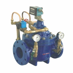 水泵控制閥是通過一個雙腔控制室,利用液壓原理控制主閥板緩慢開啟或處于調節狀態。閥門在閥蓋上配置調節螺桿裝置,因而可以控制閥門的最大開度和流量,并在必要時可以手動閥。