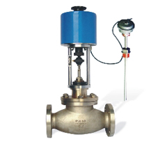 工作前主閥芯處于半開位置,傳感器處于自然狀態。接上電源,主閥芯全開。介質由箭頭方向流入主閥體、經閥芯對儲熱箱進行加熱。當溫度升到相應設定值時,傳感器即產生相應線性信號輸入一體化智能執行機構,隨即驅動閥桿、閥芯產生位移,關閉主閥芯停止加熱。當溫度低于設定值時,傳感器即產生線性信號輸入執行機構,驅使閥芯漸開,使介質按拋物線特性流入儲熱箱,進行加熱直至設定值。這樣被控介質始終在設定溫度范圍內被控制,從而達到控溫目的。